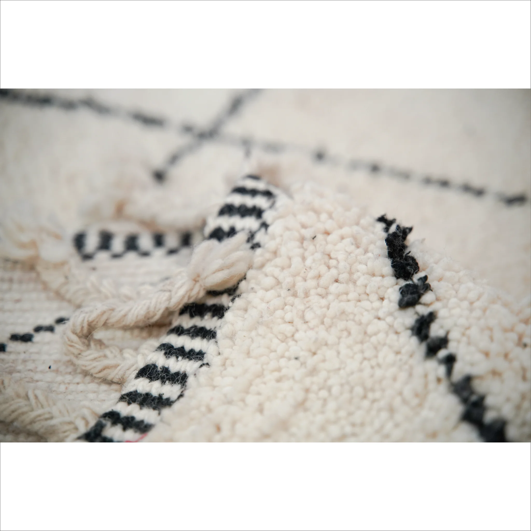 Verwandeln Sie Ihren Wohnraum mit diesem exquisiten handgefertigten marokkanischen Wollteppich. Mit einem zeitlosen Rautenmuster in tiefem Schwarz auf einem weichen cremefarbenen Hintergrund verkörpert dieser Teppich die perfekte Mischung aus traditioneller Berberkunst und modernem Design.