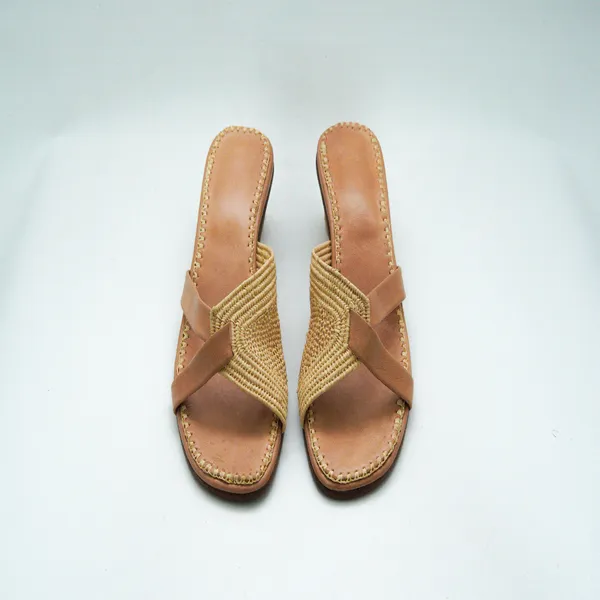 Handgefertigte marokkanische Raffia-Sandalen mit Absatz - natürliches und braunes Leder