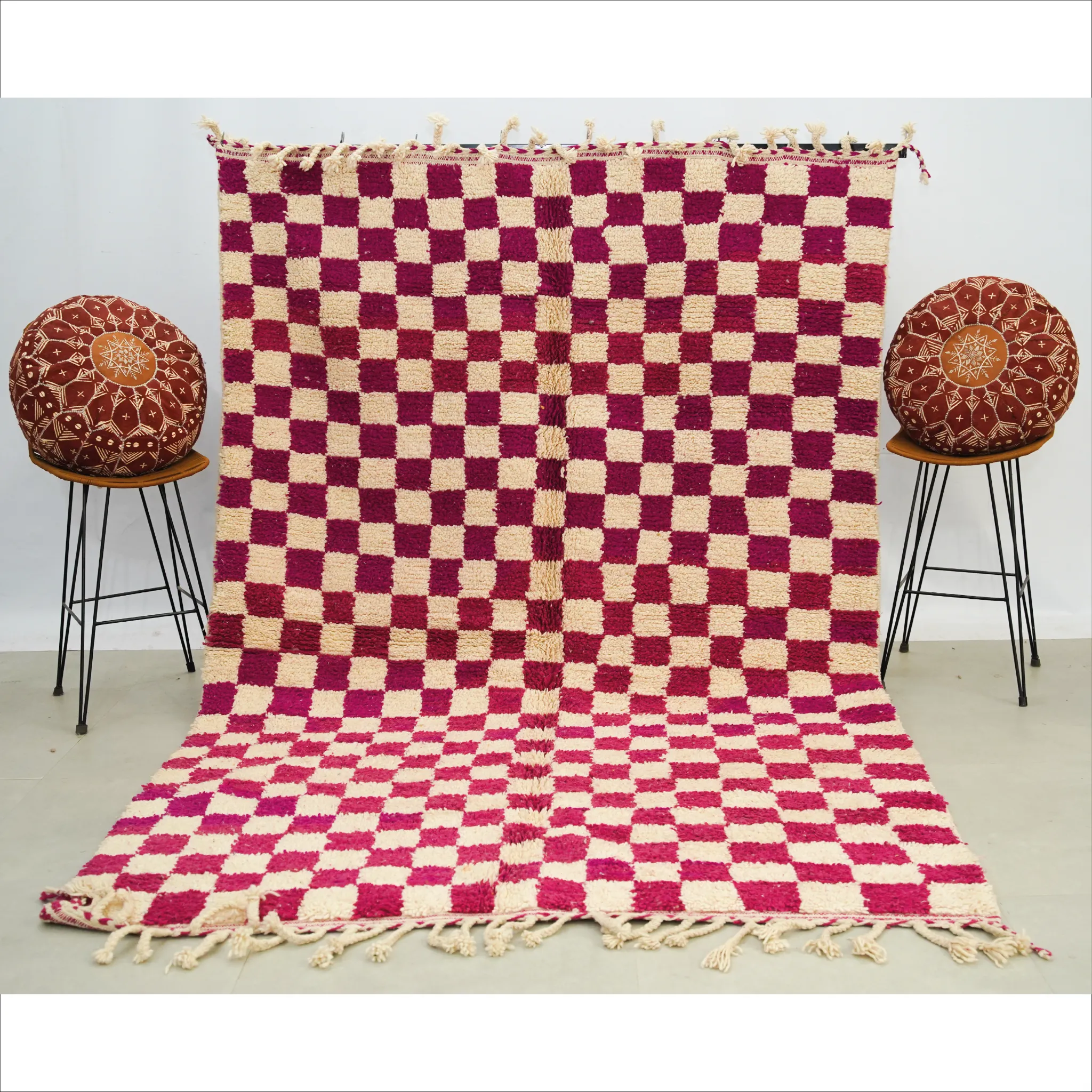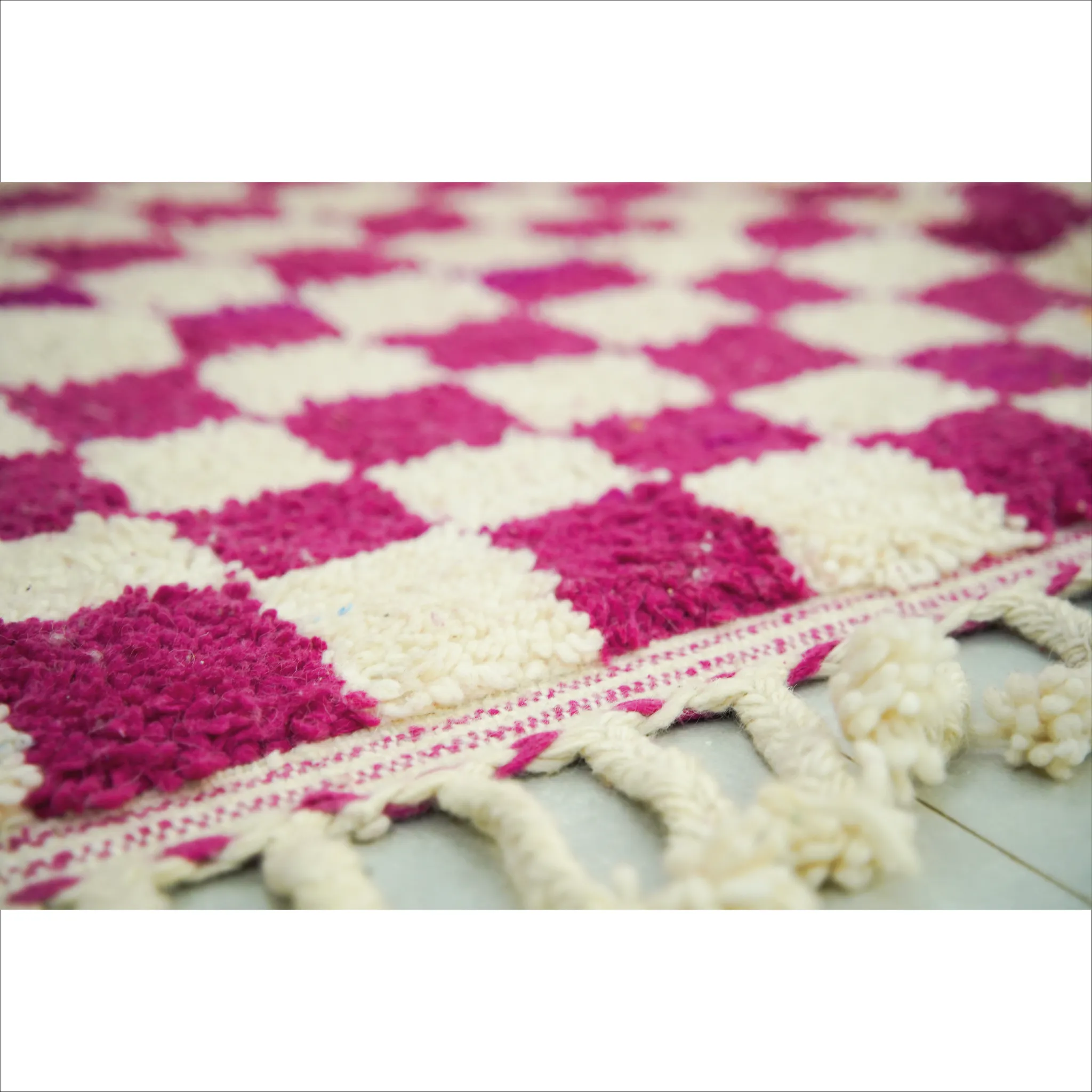 - Kühn karierter marokkanischer Wollteppich in Magenta und Elfenbein